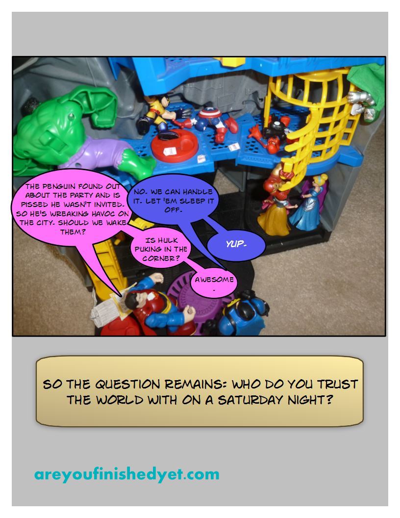 And the battle begins… I will argue that they are all certainly those things when they are sober. They just suck at being drunk 🙂 But seriously, the Dr. Doom comment made me spit out my coffee. And I will admit I really have no strong background to argue for any of these guys. My knowledge is mostly limited to snippets of cartoon DVDs my son watches and our imaginary play together. But I went with my gut on this one. 🙂