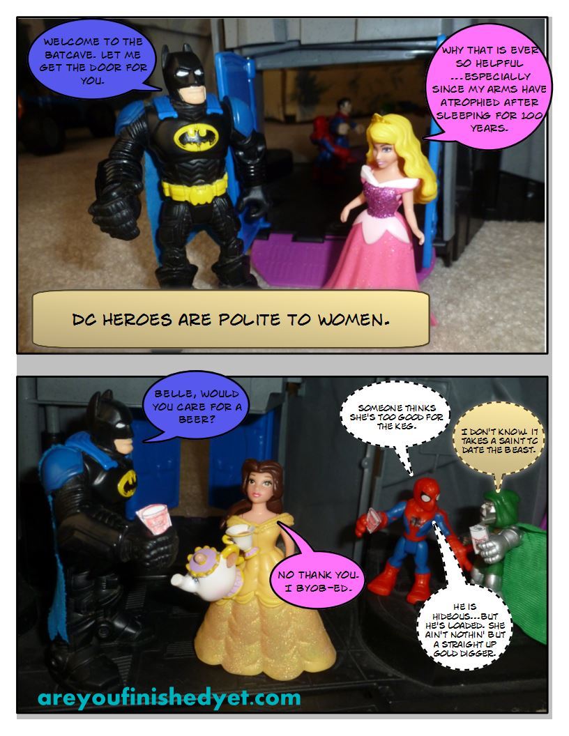 Thankfully, The Matticus Kingdom recently threw down a tug-of-war challenge asking bloggers to argue which superheroes and villains are superior: Marvel or DC? And this finally gave me a reason to fully explore how a superhero kegger would go down. I am going to firmly claim DC on this one, and I will let the ways in which each side conducts themselves at the Batcave Party illustrate why: